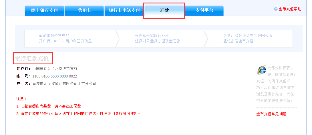 汇款完成后请您主动联系牛仔网客服010-64405008,告知您的汇款信息、牛仔网用户名,帮您查账充值金币。